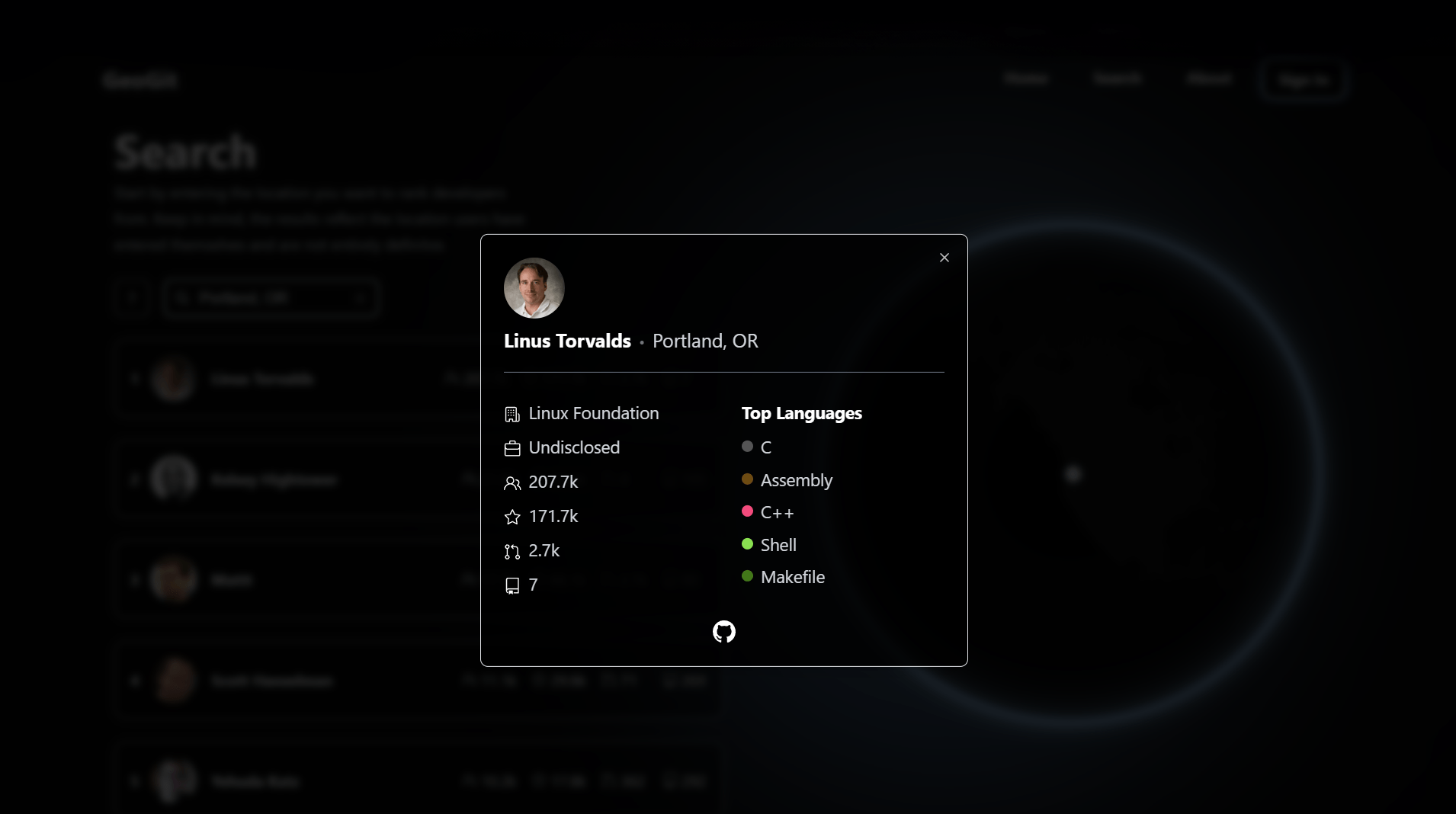 Built with GitHub Developer API, the platform provides real-time data on developers, allowing users to connect with them directly.